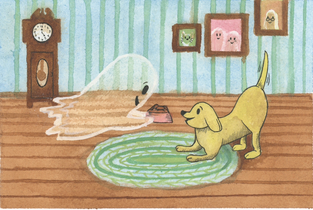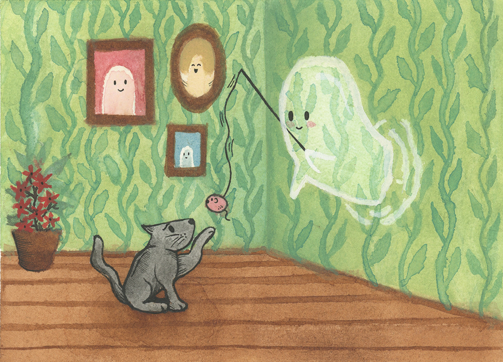 A collection of mockups for an article about pets being able to see ghosts. Done in watercolor, ink, and gouache paint. Done in 2021.