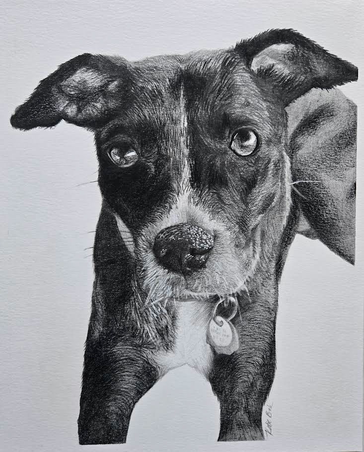 Commission of Betty the dog. 8x10 inches. Graphite and Gel Pen. 2025. Not available for sale. Custom artwork created for client.